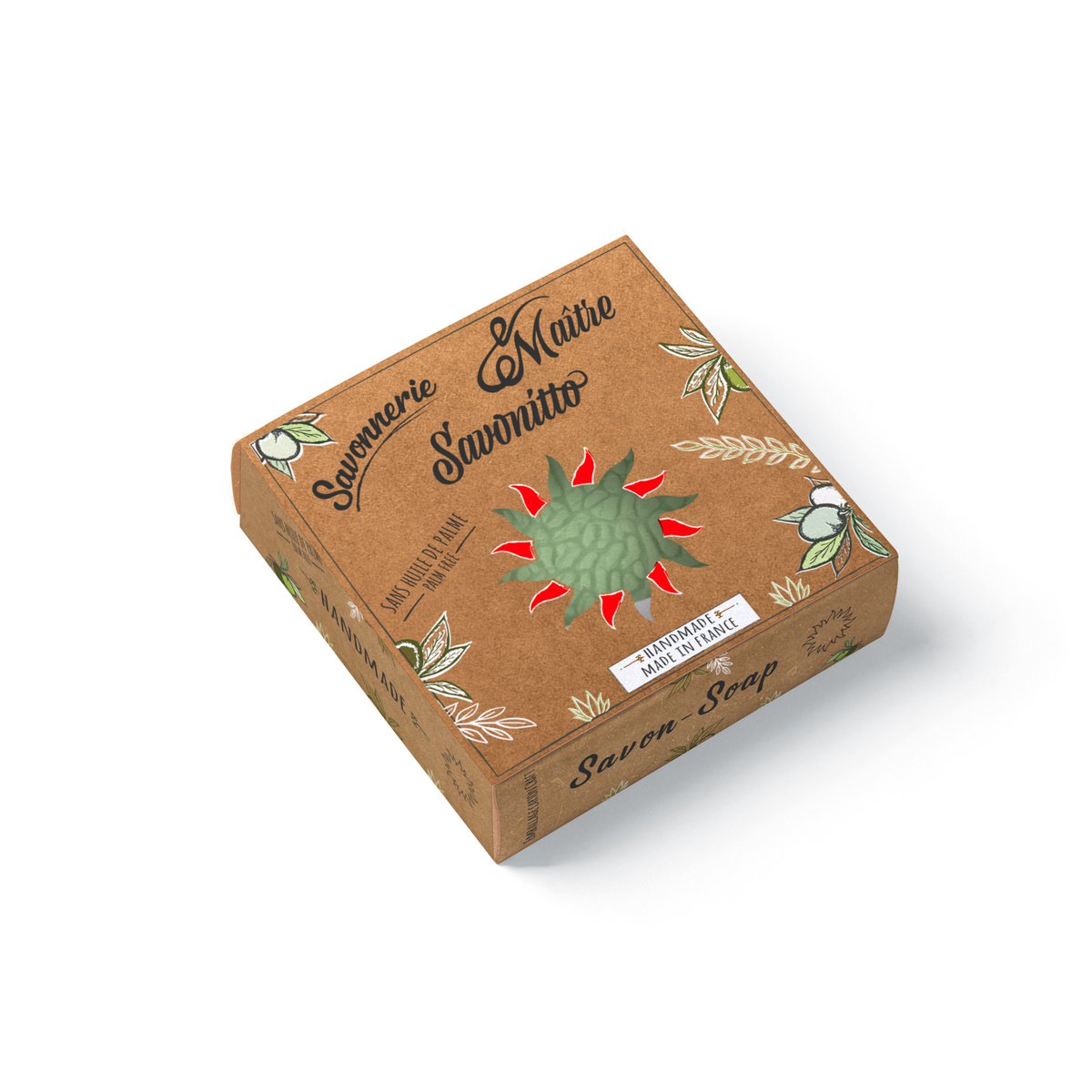 Eisenkraut-Minze-Seife mit ätherischen Ölen, basierend auf Oliven- und Kokosöl, angereichert mit rosa Ton und Feigen aus der Provence mit Sonnencreme.