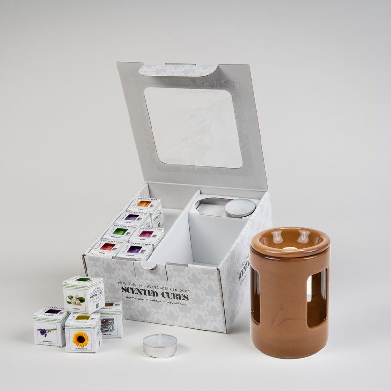 Eine Duftlampe, 10 verschiedene Scented Cubes mit je 8 Würfeln und 2 Teelichter in einer ansprechenden Geschenkbox.