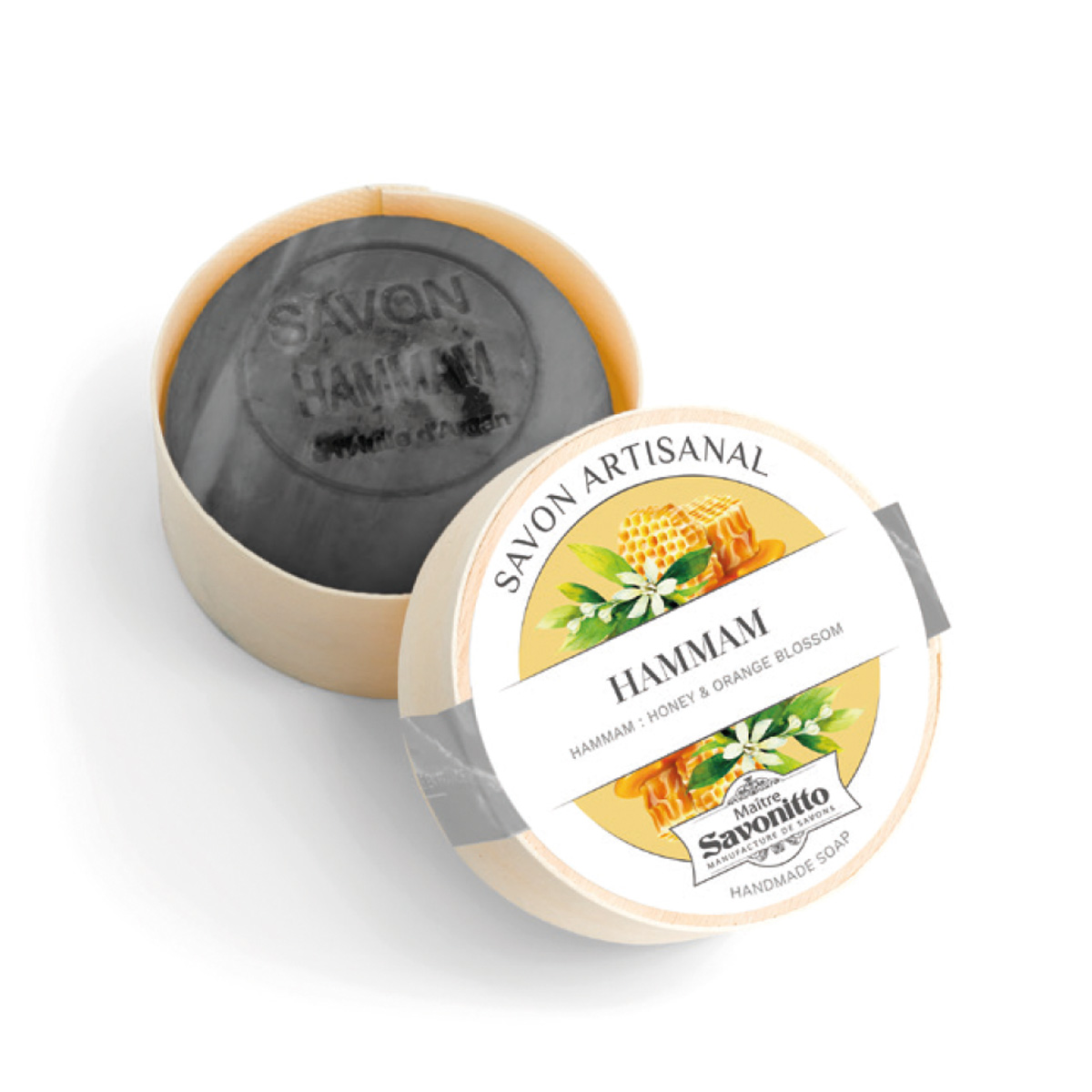 Hammam-Seife mit Orangenblüte & Akazienhonig, basierend auf Oliven- und Kokosöl, angereichert mit Arganöl.