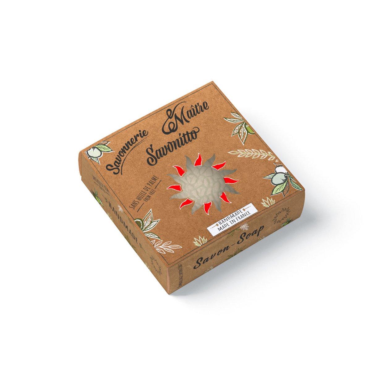 Salbei-Lavendel-Seife mit ätherischen Ölen, basierend auf Oliven- und Kokosöl, angereichert mit rosa Ton und Feigen aus der Provence mit Sonnencreme.