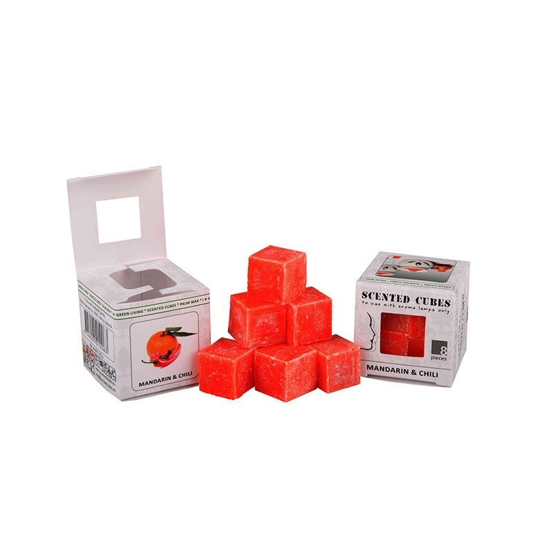 Scented Cubes Mandarine-Chili, 8 Duftwürfel in einem kleinen Karton. Mit einer Größe von nur 15 mm sind Scented Cubes besonders praktisch – sie lassen sich als Basisdüfte optimal kombinieren. Der Kreativität sind keine Grenzen gesetzt. „ACHTUNG: Bitte beachten Sie bei der Auswahl der Duftlampe eine Höhe der Lampe von ca. 12 cm. Nur so können Scented Cubes ihre volle Wirkung entfalten!“ Unser Produkt ist aus natürlichem, ökologisch angebautem Palmwachs. Dieser Rohstoff wächst nach und ist sauber.