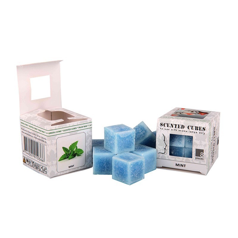 Scented Cubes Minze, 8 Duftwürfel in einem kleinen Karton. Mit einer Größe von nur 15 mm sind Scented Cubes besonders praktisch – sie lassen sich als Basisdüfte optimal kombinieren. Der Kreativität sind keine Grenzen gesetzt. „ACHTUNG: Bitte beachten Sie bei der Auswahl der Duftlampe eine Höhe der Lampe von ca. 12 cm. Nur so können Scented Cubes ihre volle Wirkung entfalten!“ Unser Produkt ist aus natürlichem, ökologisch angebautem Palmwachs. Dieser Rohstoff wächst nach und ist sauber.