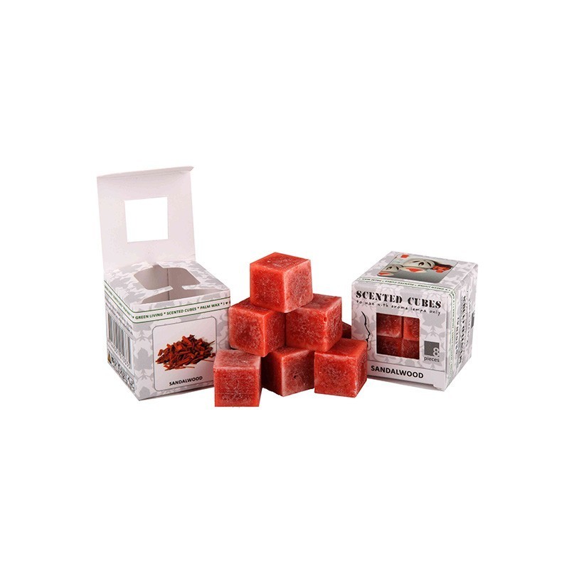 Scented Cubes Sandelholz, 8 Duftwürfel in einem kleinen Karton. Mit einer Größe von nur 15 mm sind Scented Cubes besonders praktisch – sie lassen sich als Basisdüfte optimal kombinieren. Der Kreativität sind keine Grenzen gesetzt. „ACHTUNG: Bitte beachten Sie bei der Auswahl der Duftlampe eine Höhe der Lampe von ca. 12 cm. Nur so können Scented Cubes ihre volle Wirkung entfalten!“ Unser Produkt ist aus natürlichem, ökologisch angebautem Palmwachs. Dieser Rohstoff wächst nach und ist sauber.