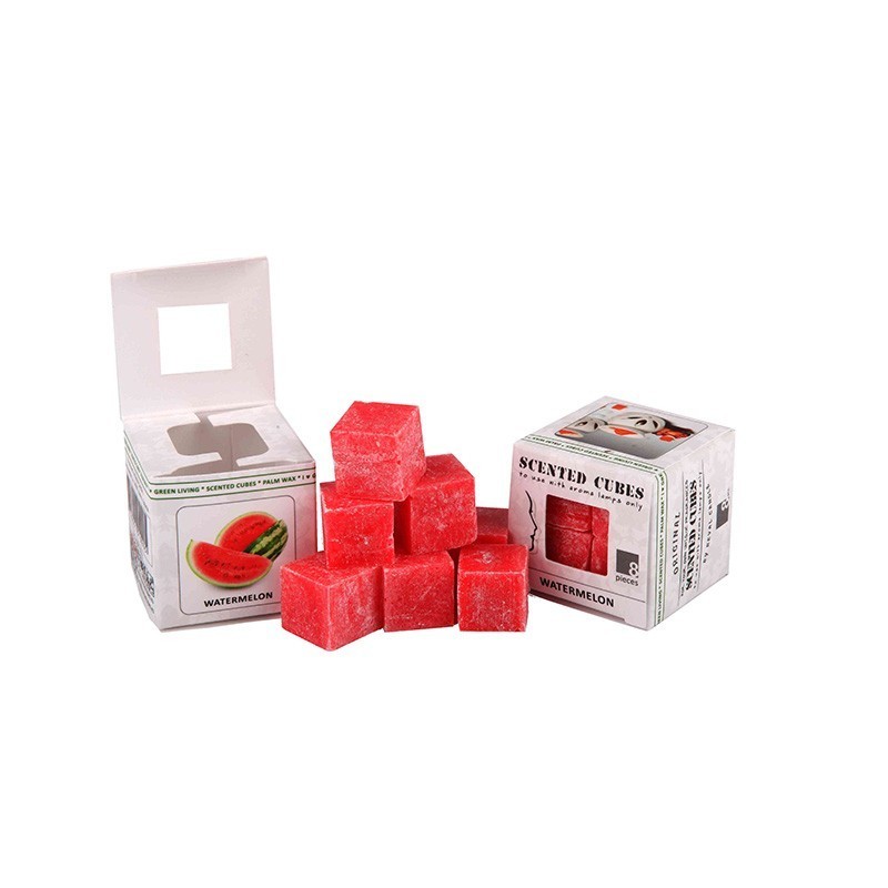 Scented Cubes Wassermelone, 8 Duftwürfel in einem kleinen Karton. Mit einer Größe von nur 15 mm sind Scented Cubes besonders praktisch – sie lassen sich als Basisdüfte optimal kombinieren. Der Kreativität sind keine Grenzen gesetzt. „ACHTUNG: Bitte beachten Sie bei der Auswahl der Duftlampe eine Höhe der Lampe von ca. 12 cm. Nur so können Scented Cubes ihre volle Wirkung entfalten!“ Unser Produkt ist aus natürlichem, ökologisch angebautem Palmwachs. Dieser Rohstoff wächst nach und ist sauber.