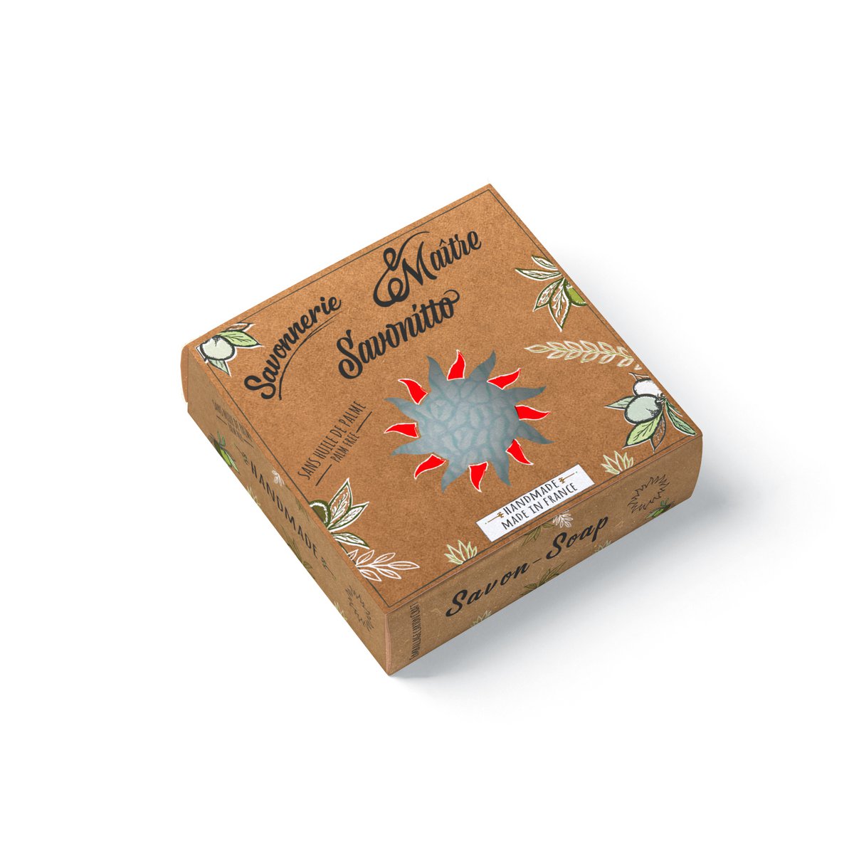 Thymian-Rosmarin-Lavendel-Seife mit ätherischen Ölen, basierend auf Oliven- und Kokosöl, angereichert mit rosa Ton und Verveine aus der Provence mit Sonnencreme.